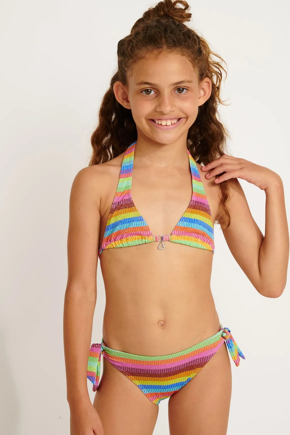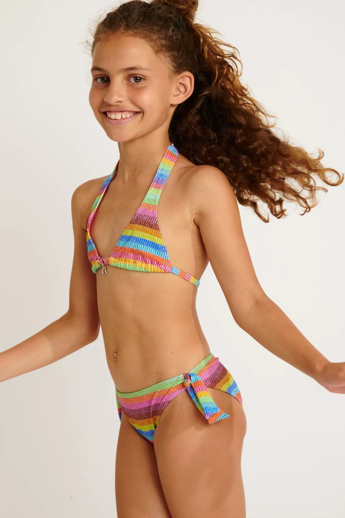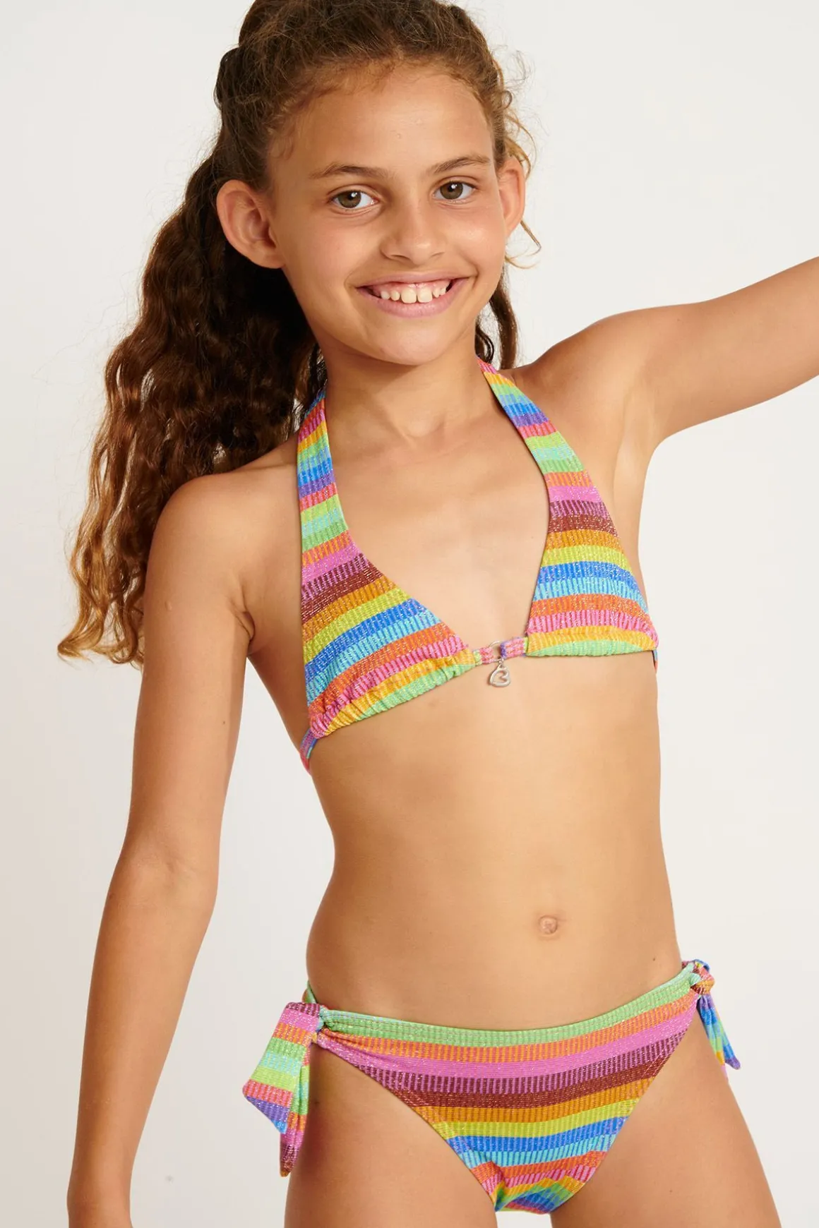 | Details | • Girl’s two-piece swimsuit • Colorful print with lurex accents • Bows on the sides • Tie-back closure |