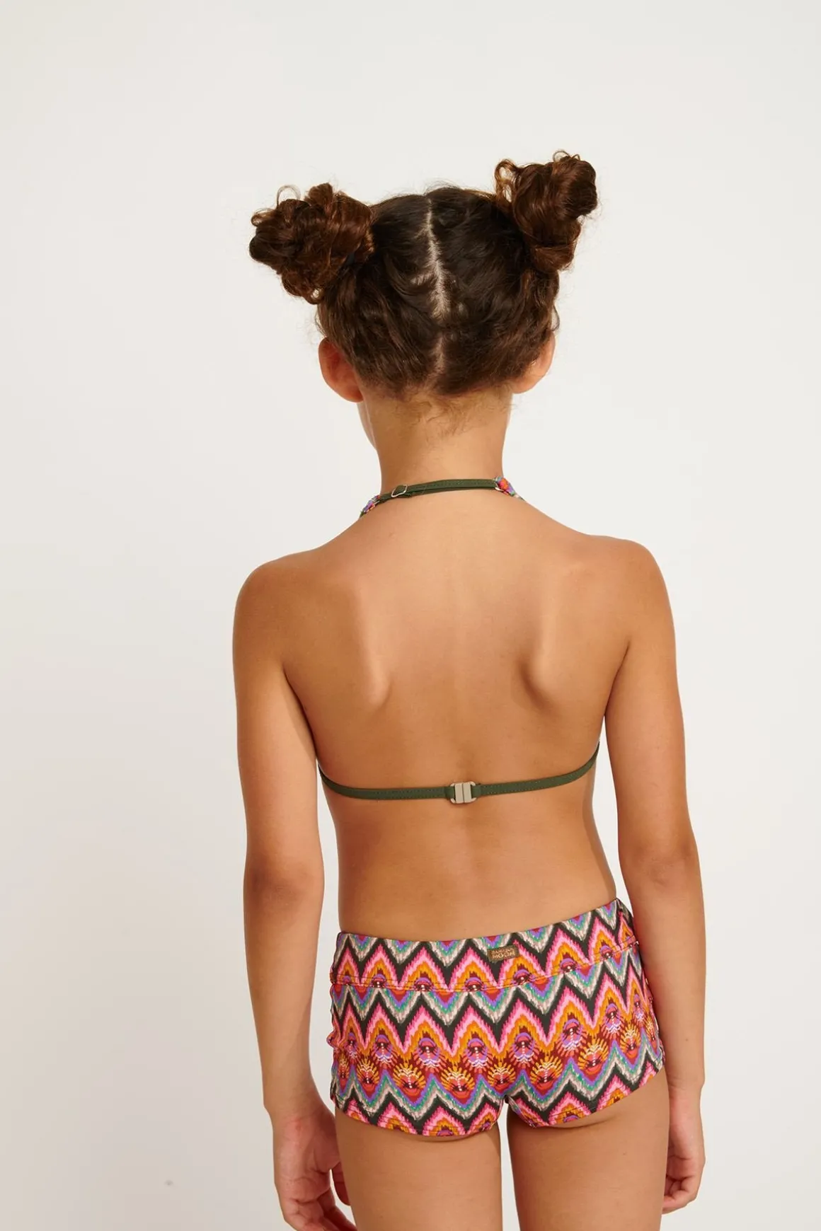 | Details | • Triangle bikini for girls • Exotic print • Back tie • Adjustable halter neck |