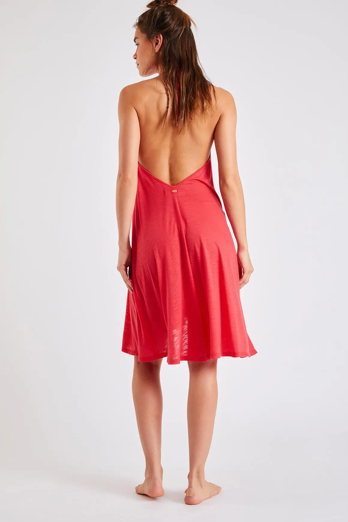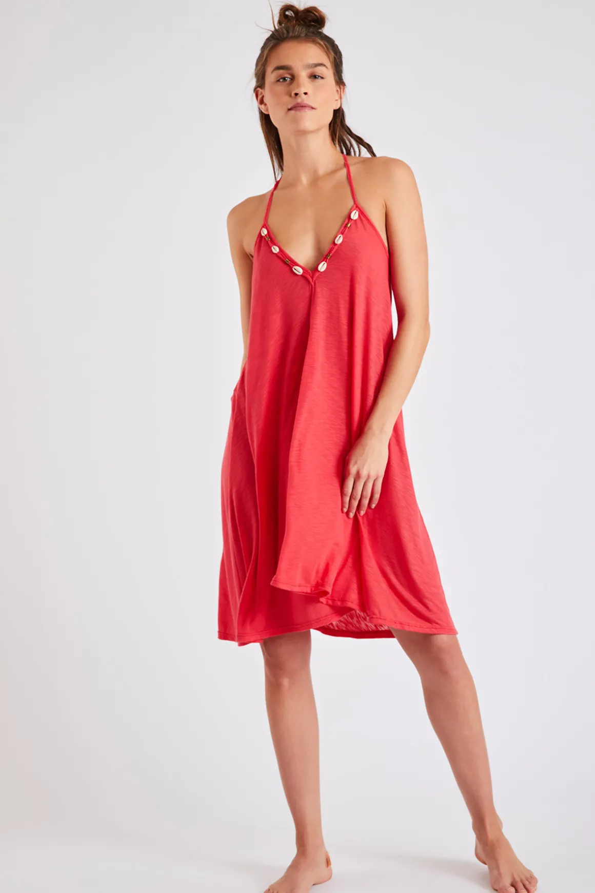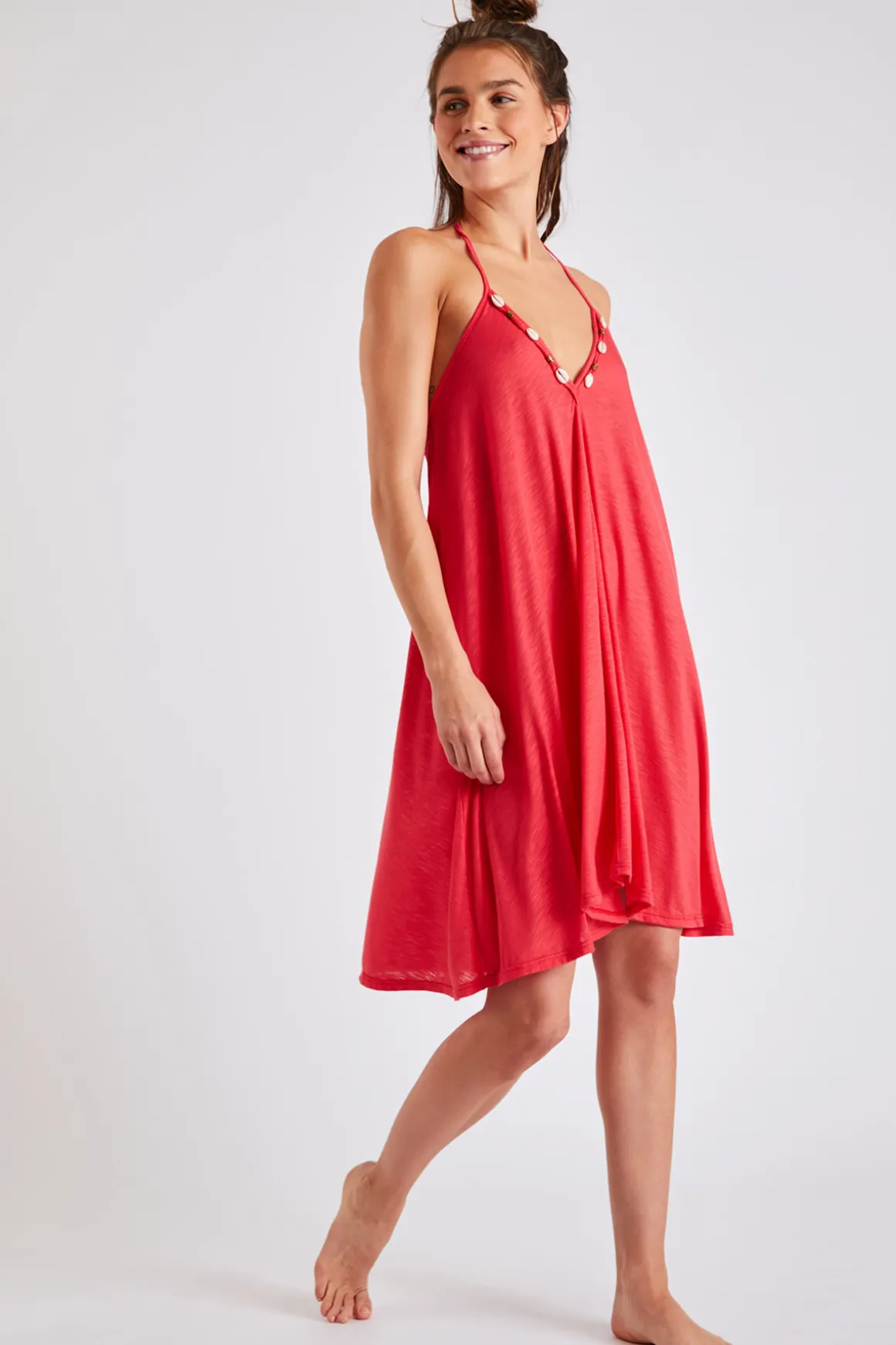 | Details | • Backless beach dress • Red • Shells on the neckline • Ties around the neck • Lightweight and loose-fitting fabric |