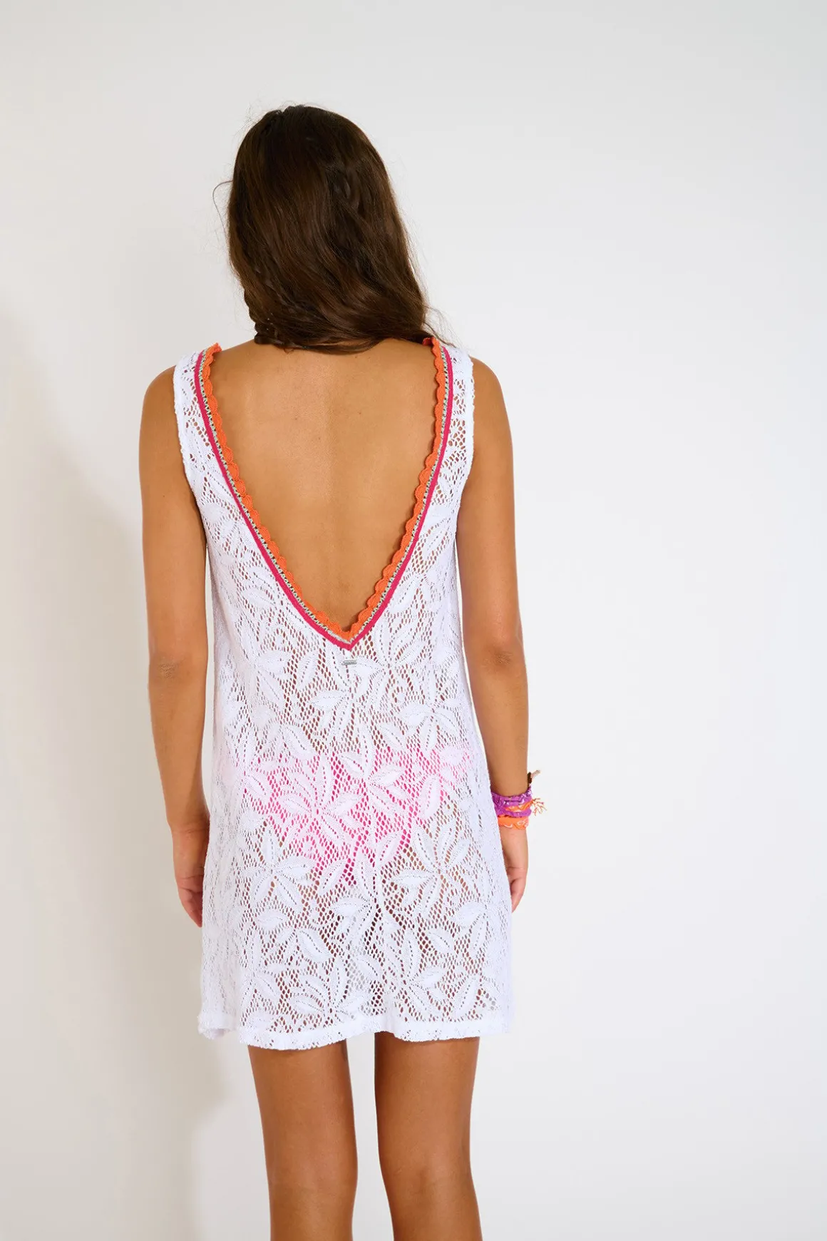 | Details | • Short beach dress • Low cut back • Crochet style open weave fabric • Colourful braid detail |