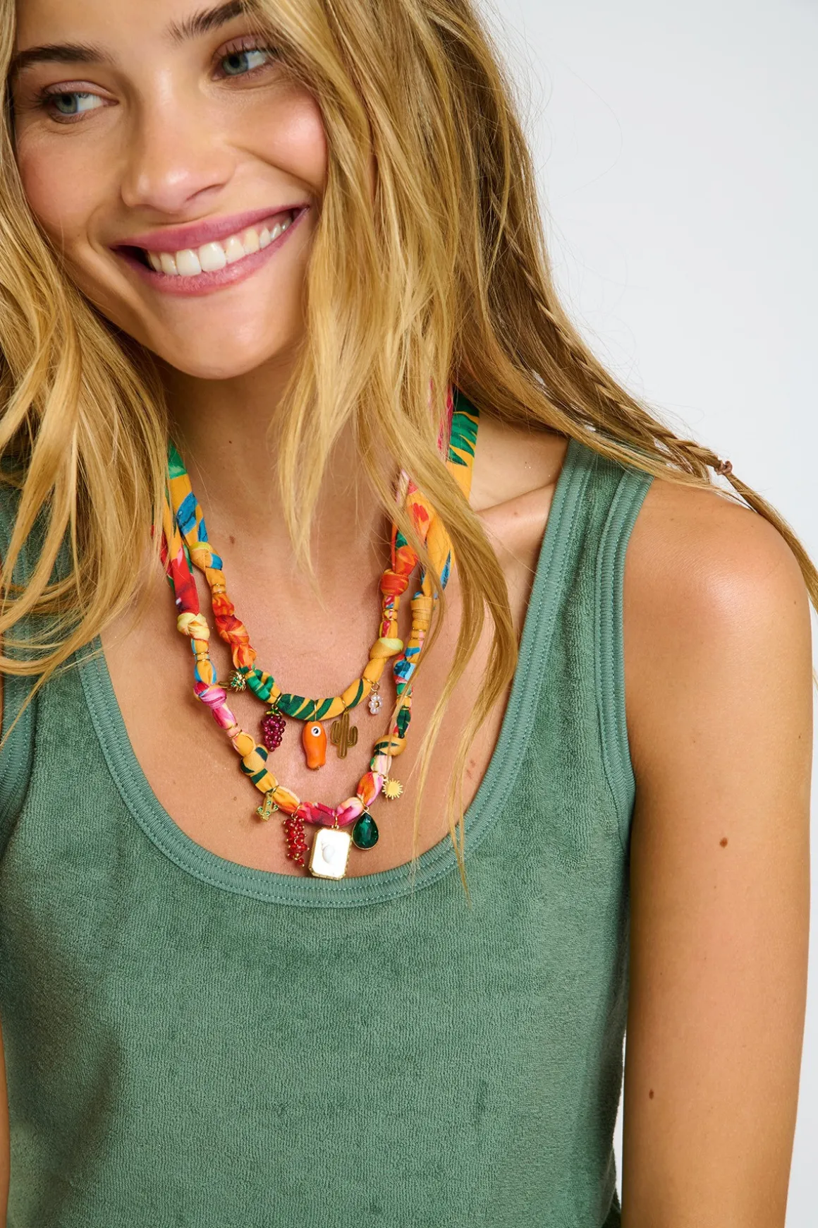 | Details | • Lycra Tie Necklace • Exclusive collaboration Banana Moon x Badhnati Jewelry • Handmade • Printed • Gold charms • Long model, approximately 70 cm • Can be worn as a necklace or multi-wrap bracelet |
