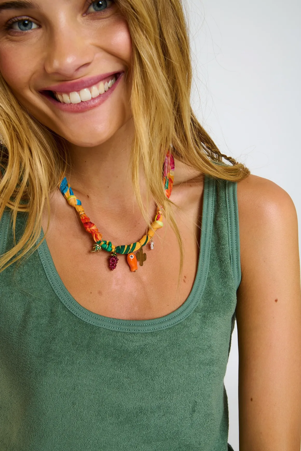 | Details | • Tie necklace • Exclusive collaboration Banana Moon x Badhnati Jewelry • Handmade • Printed • Gold charms • Short model 60 cm • Can be worn as a necklace or double wrap bracelet |