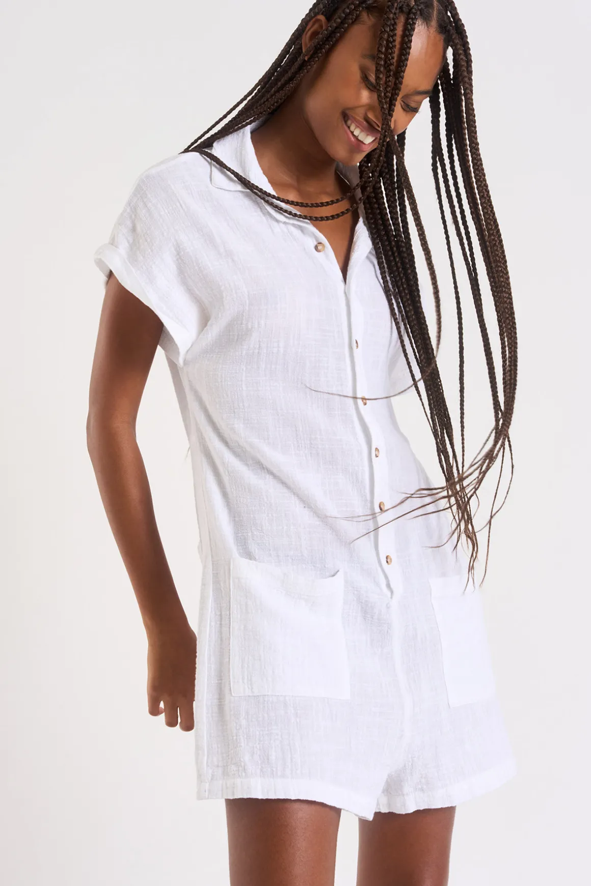| Details | • Rompers • Buttons up the front • Shirt collar • Short sleeves • Solid-coloured • Pockets on bottom front of dress • 100% cotton |