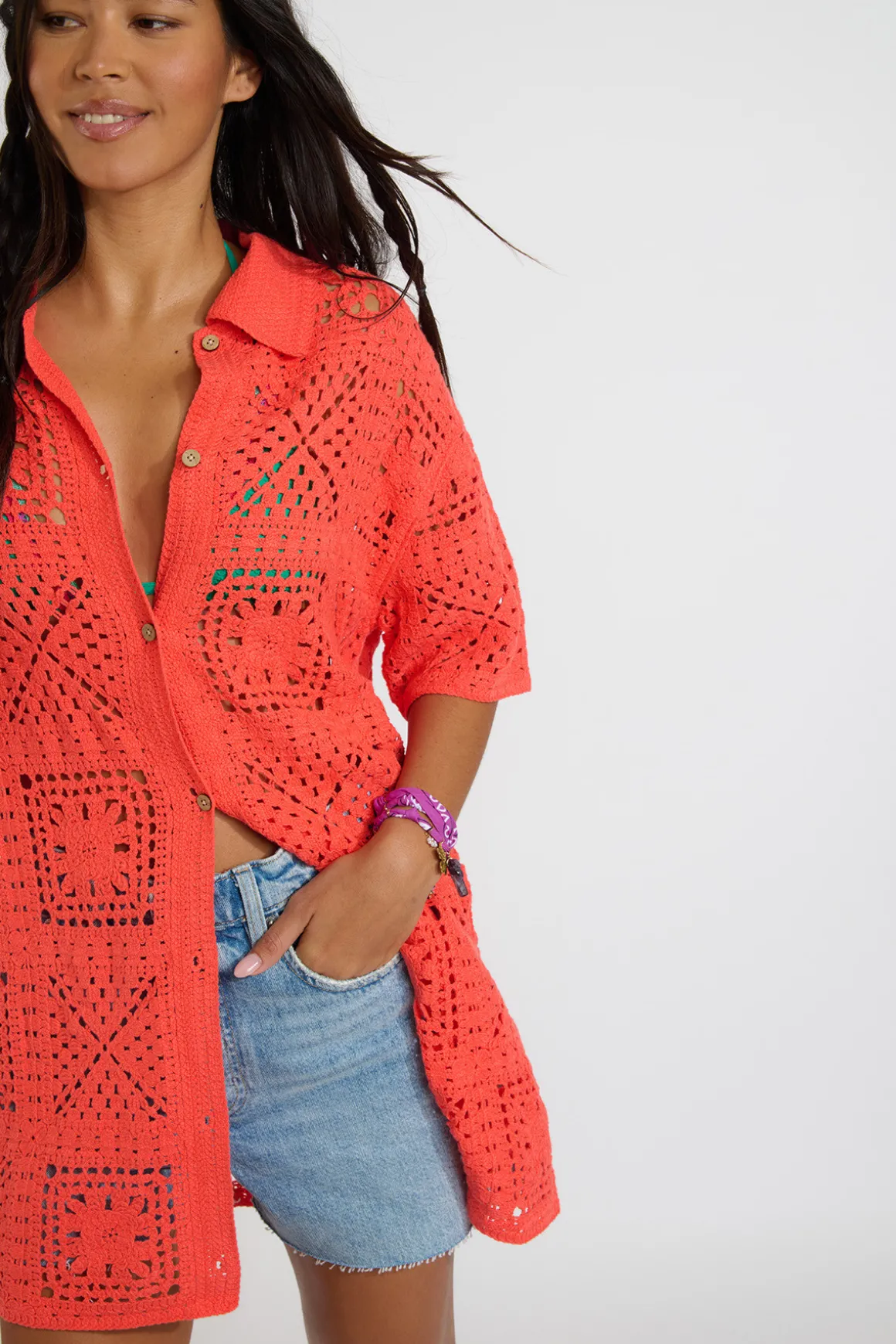 | Description | KIRIA MINORCA long orange crochet shirt. Its openwork crochet fabric subtly reveals the silhouette while adding a trendy, boho touch. With its bright and energetic colour, this piece becomes the highlight of your outfit. Light, feminine and effortless, it’s ideal over a swimsuit for a chic beach-ready look. |