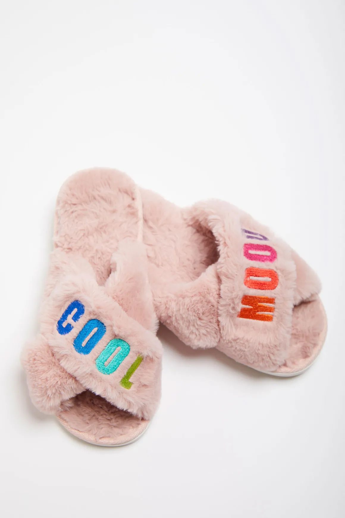 | Details | • Faux fur slippers • Crisscross straps • Cool Mood” tone-on-tone embroidery • Rainbow colors • Anti-slip soles • 3 sizes: 36/37 38/39 40/41 |