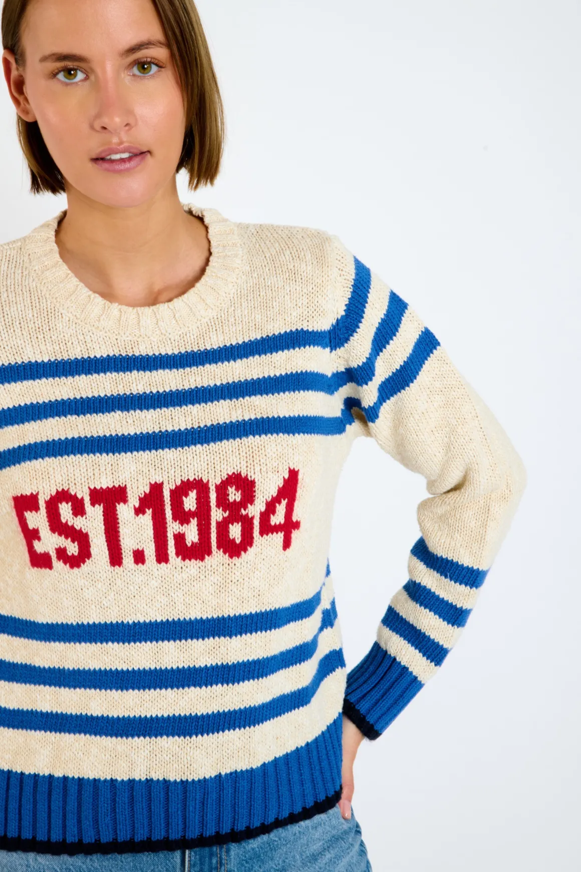 | Details | • Light sweater for women • Blue stripes |