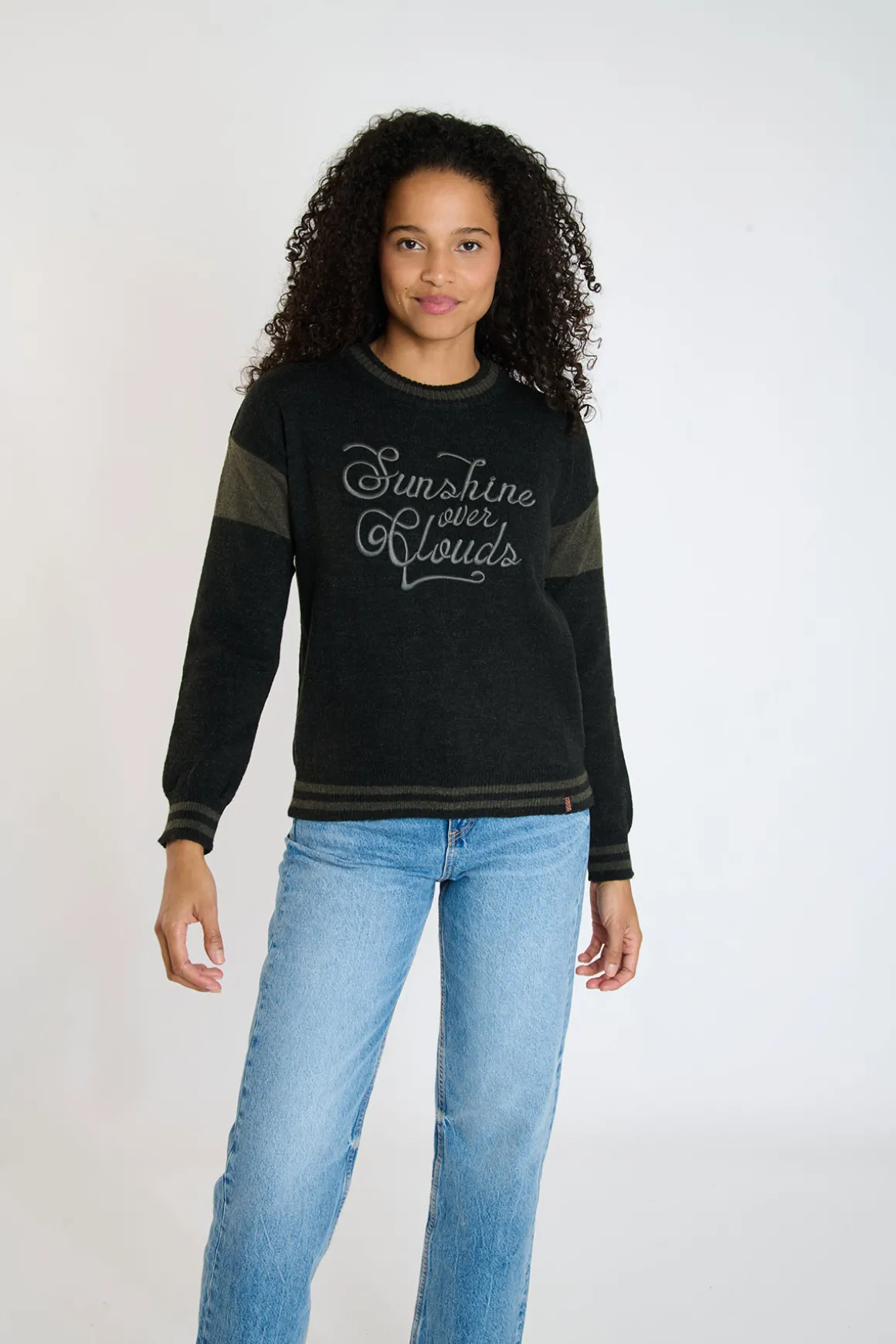| Description | ROSARIO ROMANE anthracite grey women’s sweater. Adopt a comfortable and stylish look with its embroidered “Sunshine Over Clouds” lettering on the chest. Perfect for a city outing. |