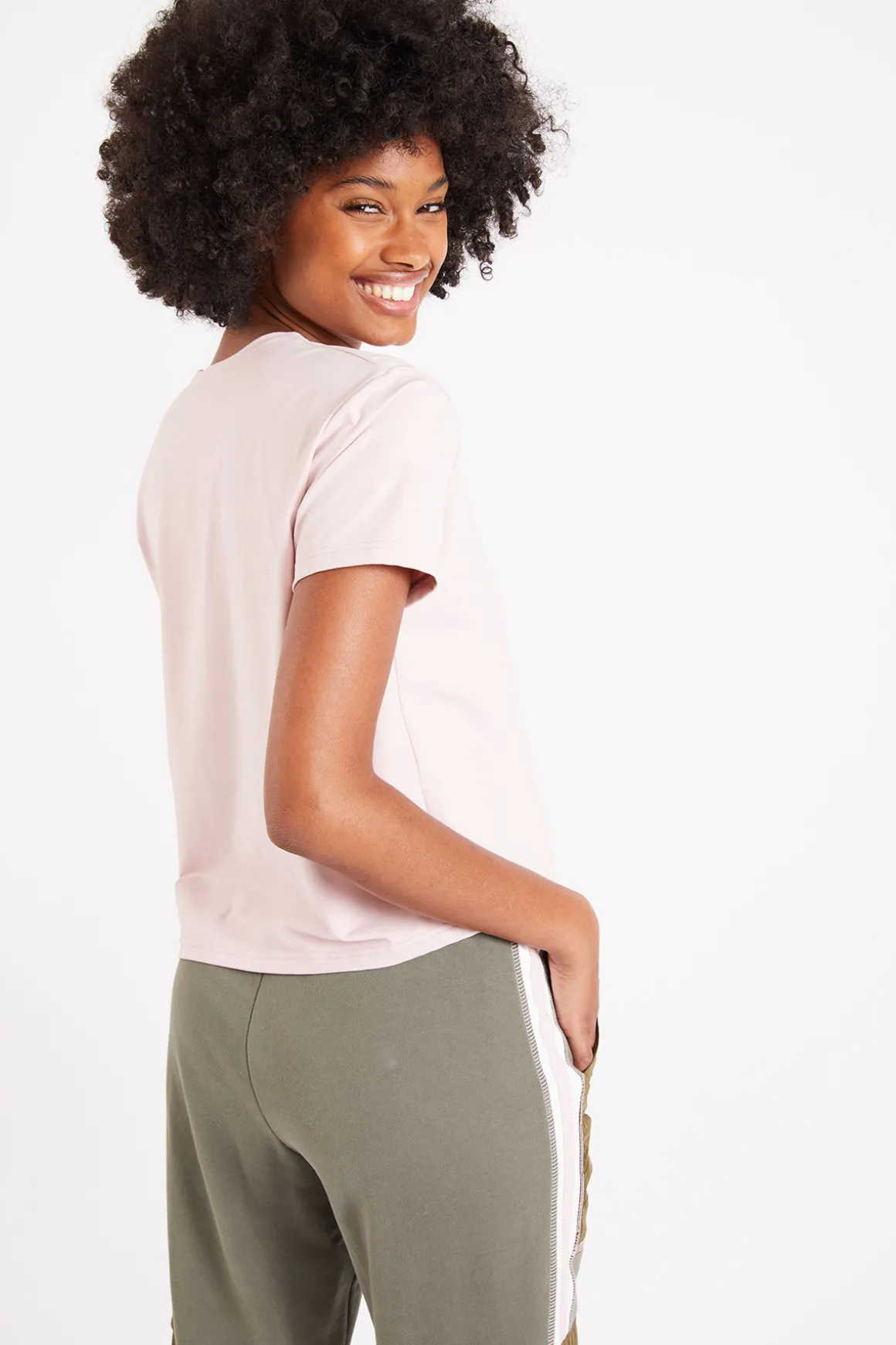 | Details | • Women’s short sleeve T-shirt • Pink • Straight cut • Round neck • Lightweight, breathable fabric • Our model is 5’8” and wears a size 36/S |