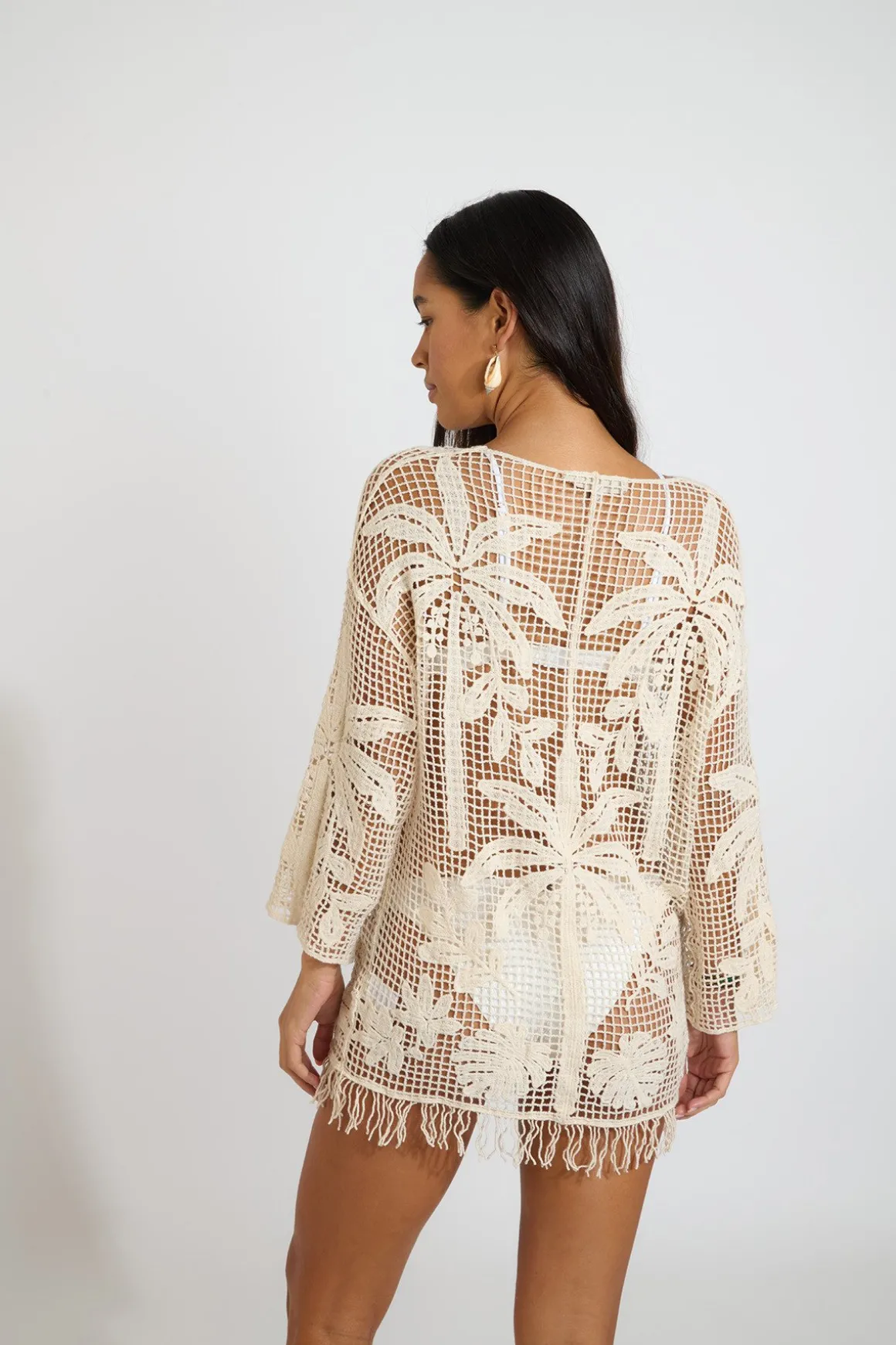| Details | • Crochet beach tunic • Long sleeves • Patterned openwork fabric • Fringed details |