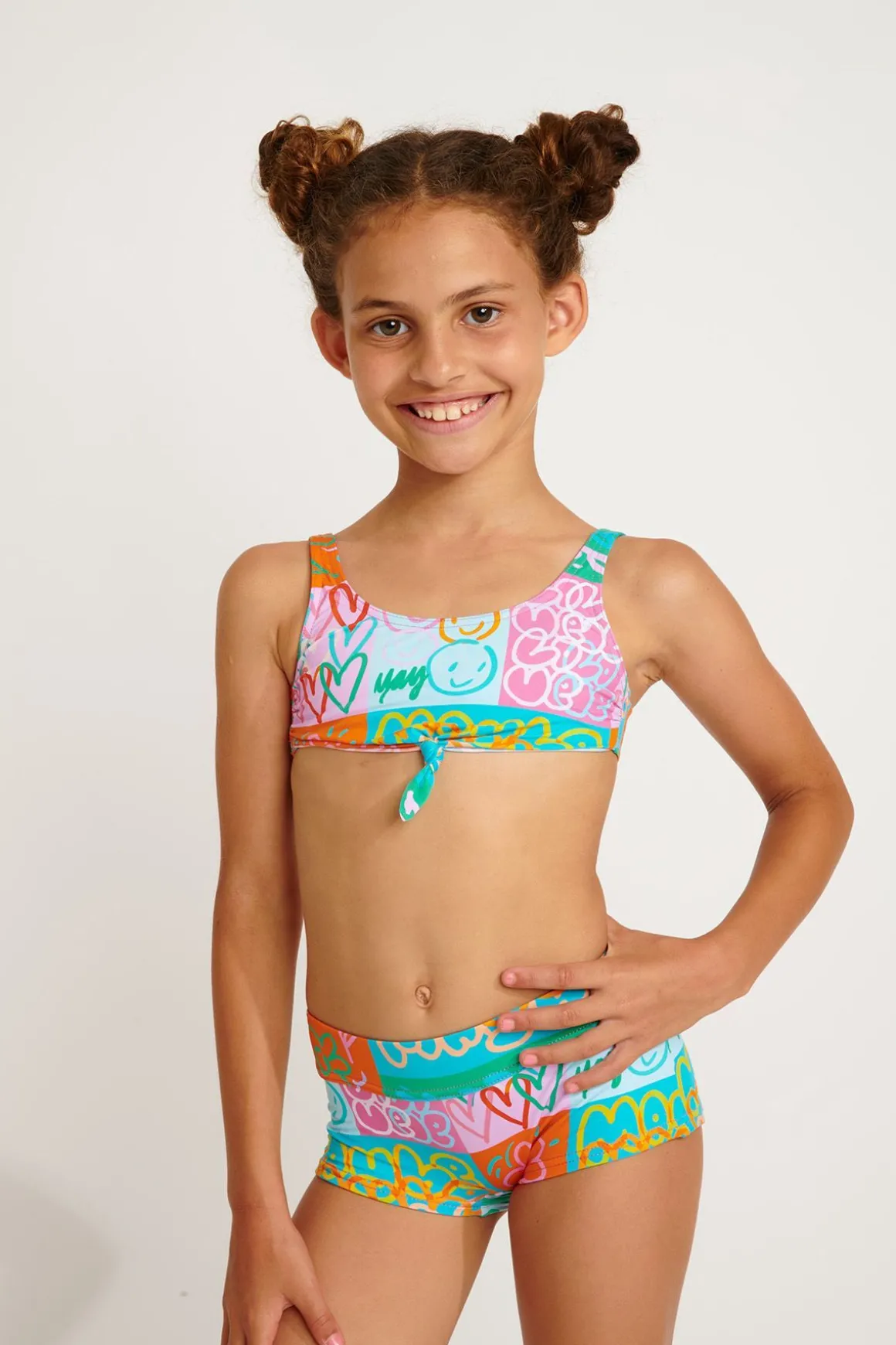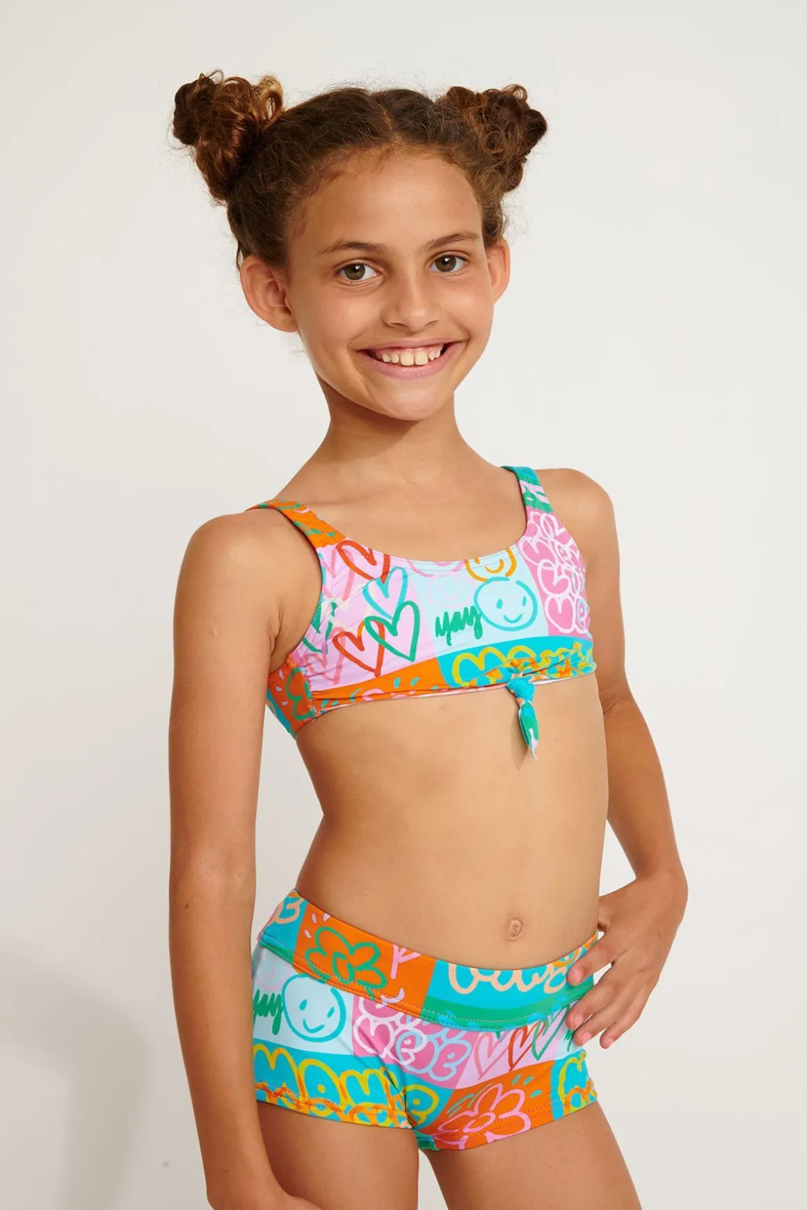 | Details | • Two-piece swimsuit for little girl • Tied bandeau top • Comfortable shorty bottom • Drawing print |