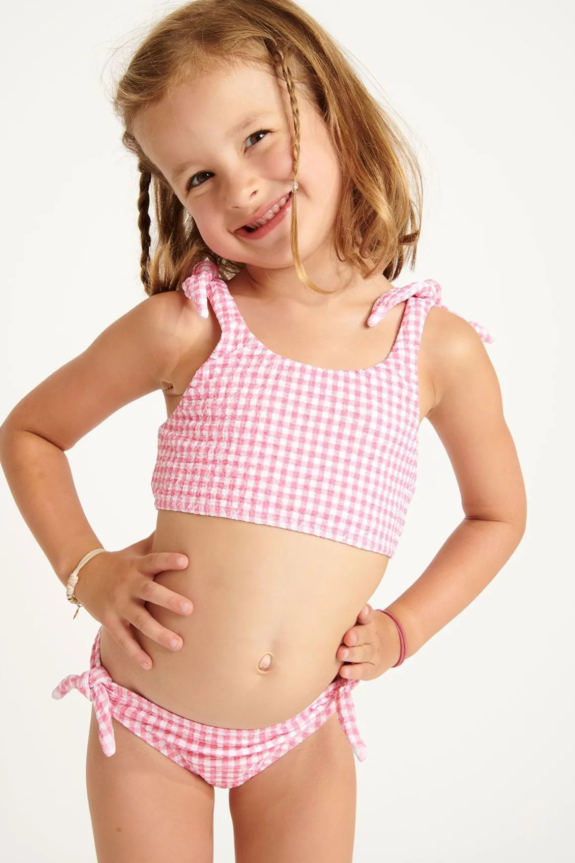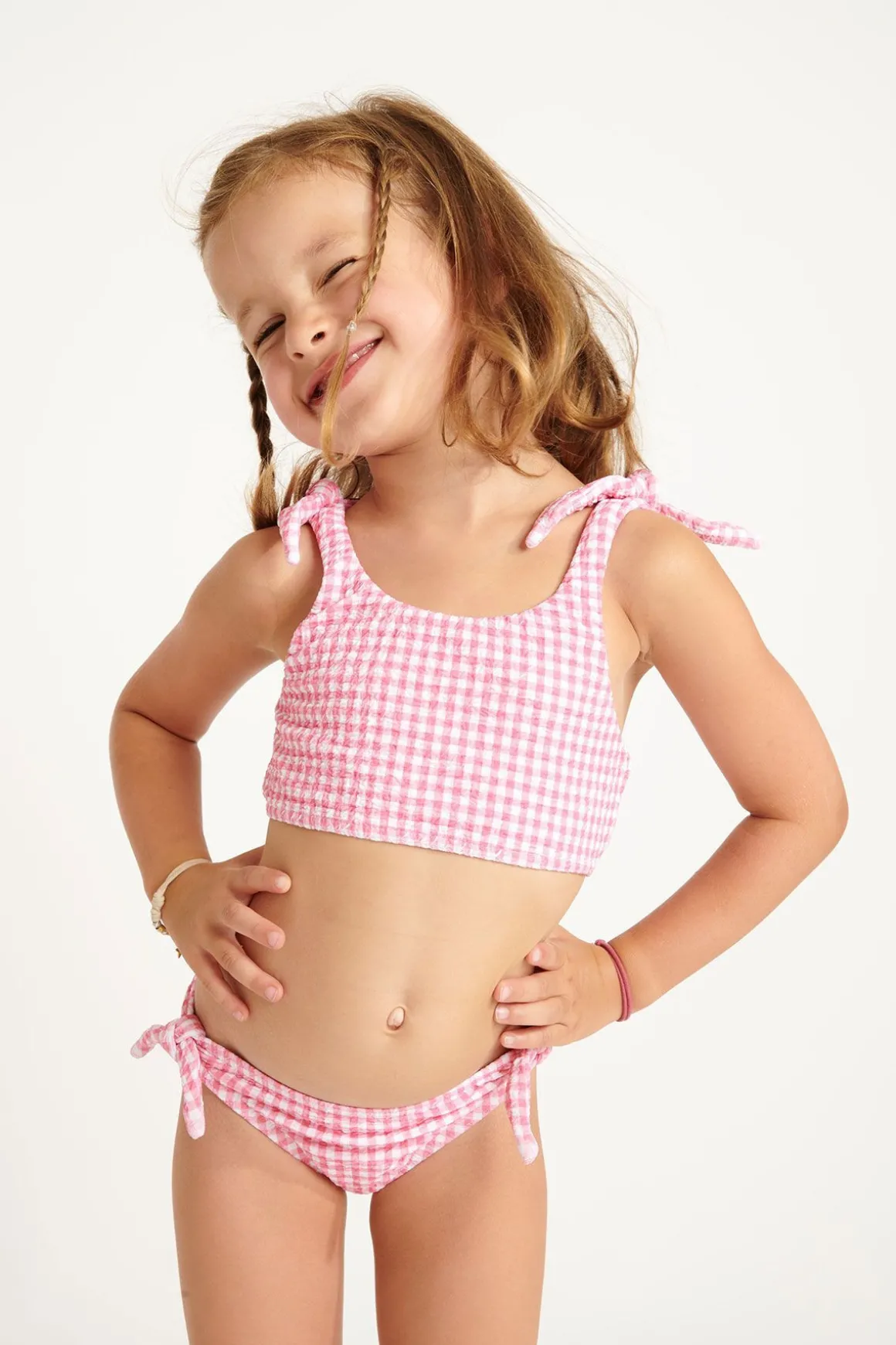 | Details | • Two-piece swimsuit • Bandeau top and tied bottom • Straight tied straps • Checked |