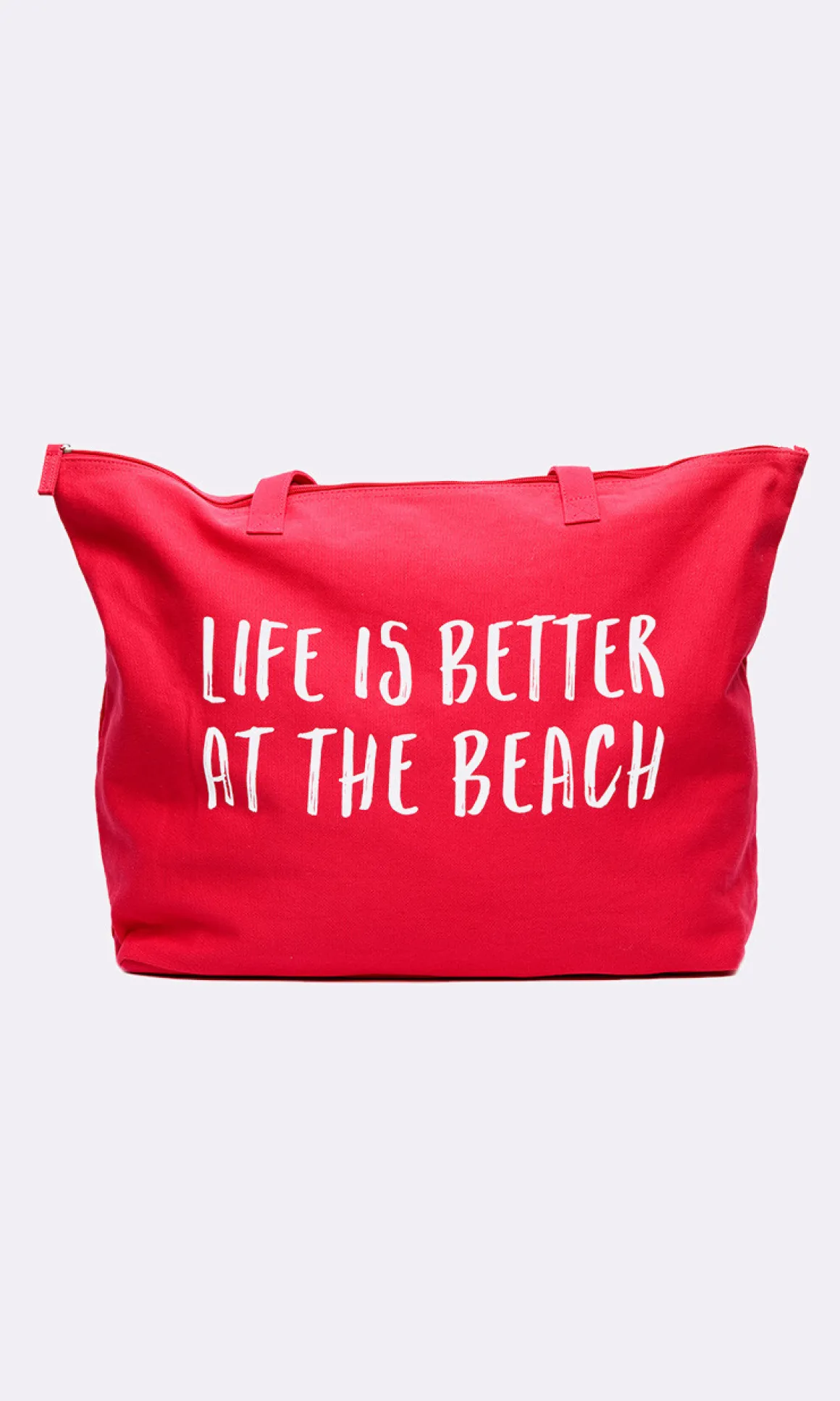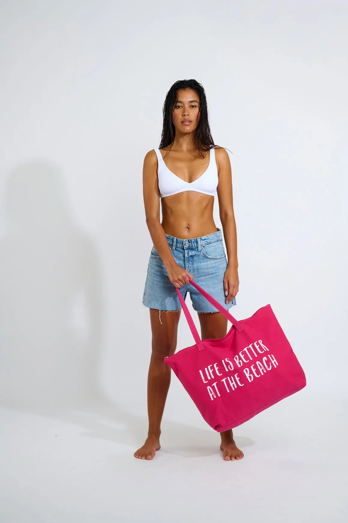 | Details | • Cotton beach bag • Fuchsia pink • White screen-prints • Zip fastening, tone on tone • Dimensions: 58 x 38cm |