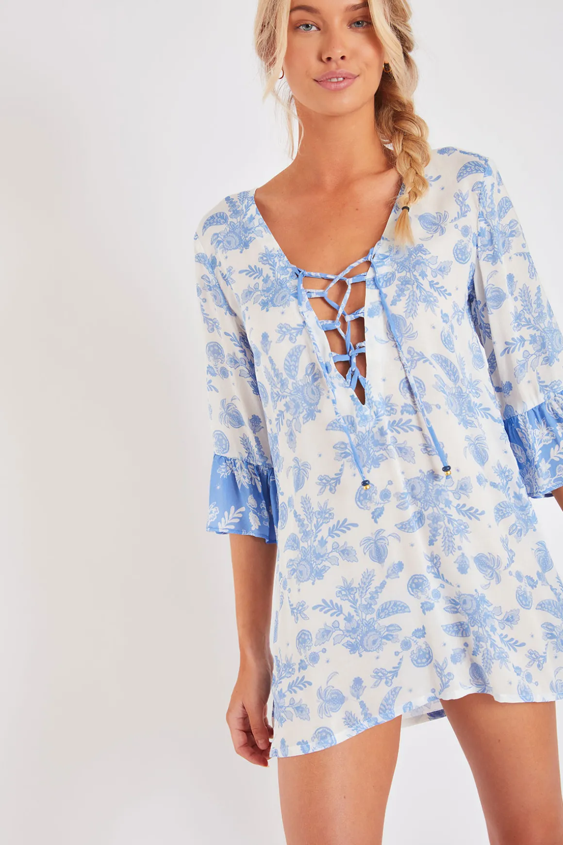 | Details | • Beach tunic • White with sky blue print • Plunging neckline with pom-pom ties • 3/4 flared sleeves • Loose-fitting fabric |