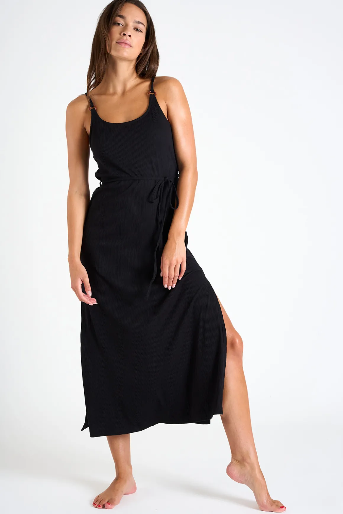 | Details | • Long beach dress • Adjustable spaghetti straps • Adjustable belt • Ring detail • Split leg • Floaty, comfortable fabric |