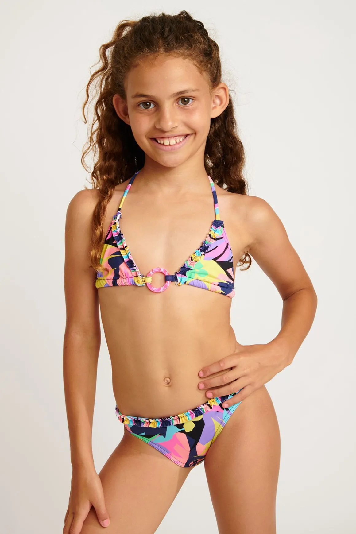 | Details | • Girl’s two-piece triangle swimsuit • Retro graphic print • Fancy ring • Back tie • Adjustable choker |
