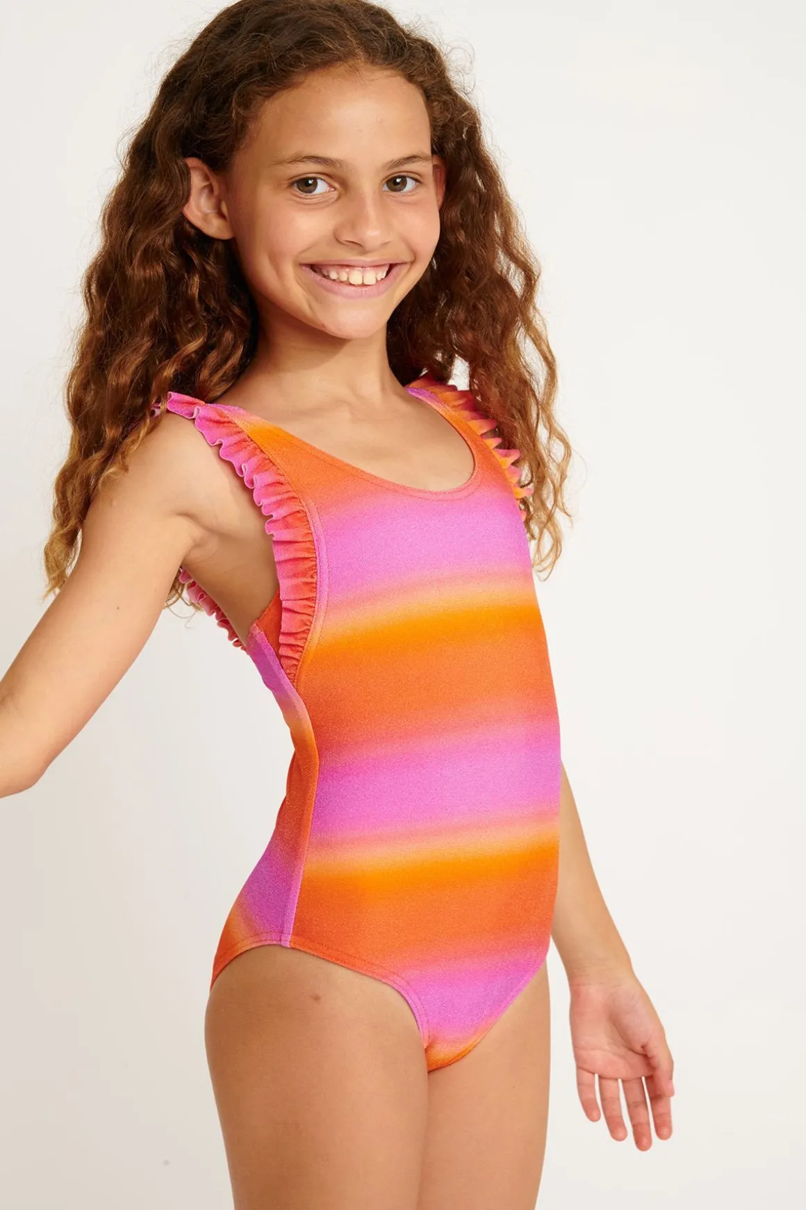 | Details | • One-piece girl swimsuit • Easy to slip on • Tie-dye print • Ruffles on straps |