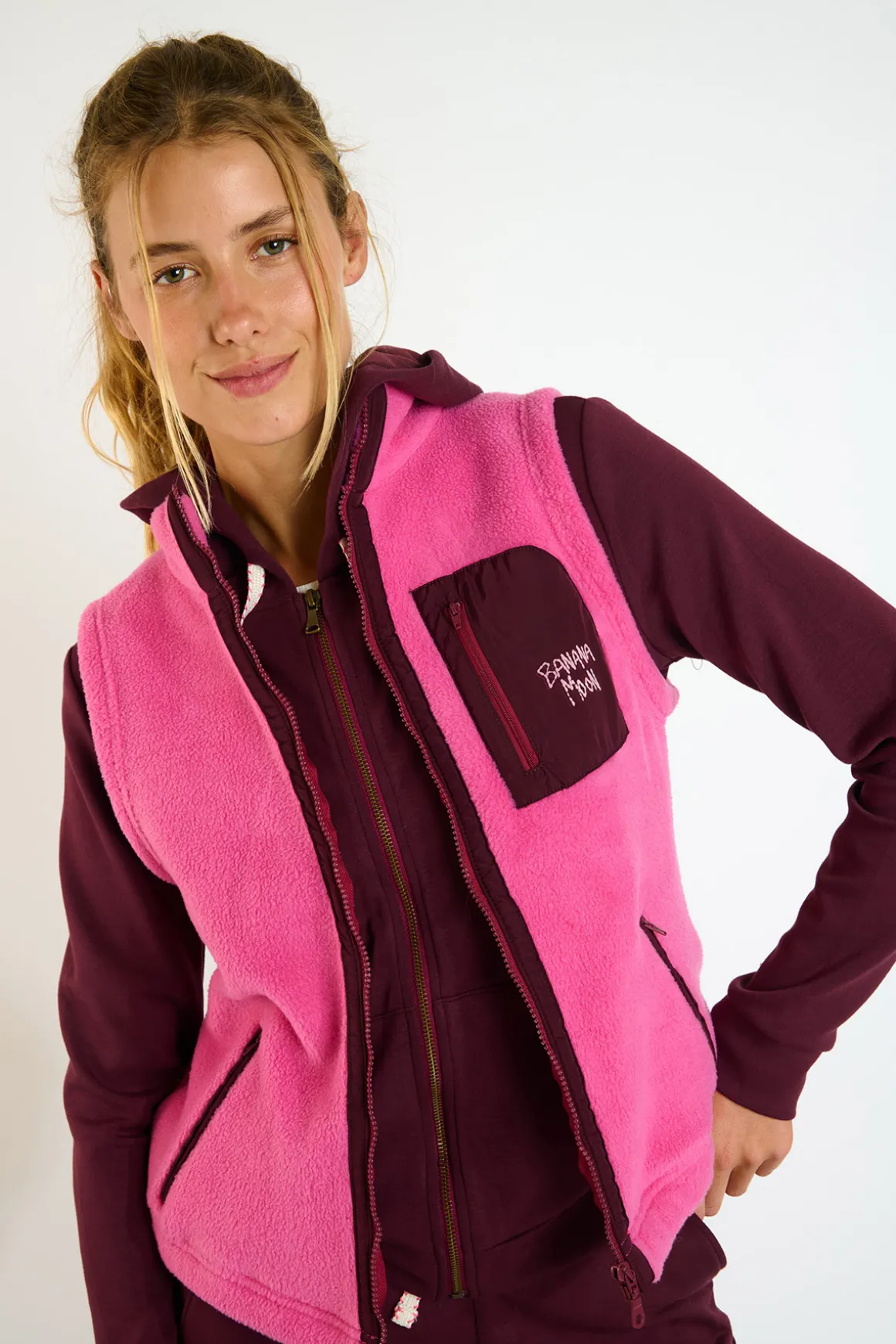 | Details | • Sleeveless fleece • 3 zippered pockets • Nylon details • High collar • “Banana Moon” prints on front pocket and back |