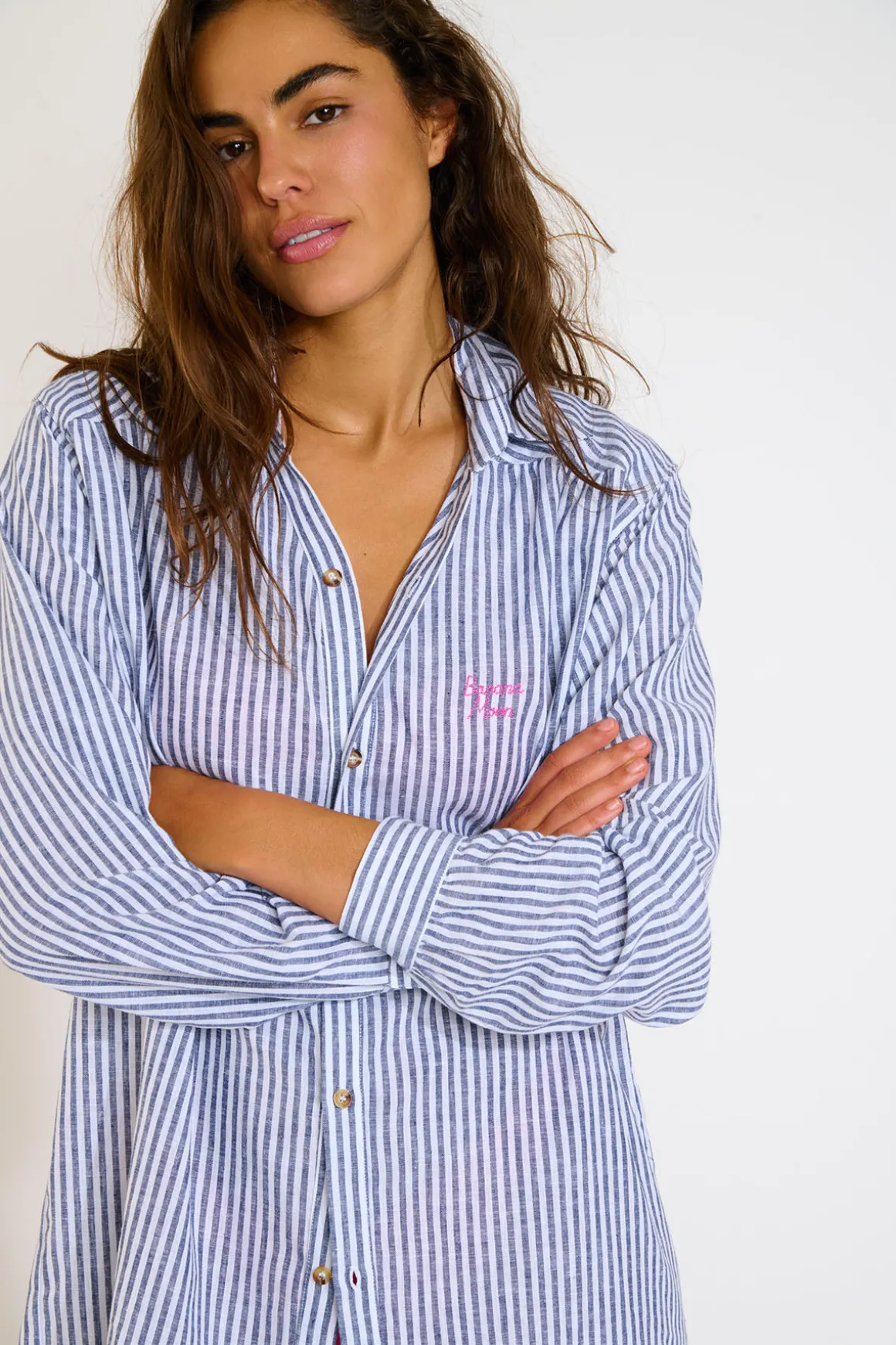 | Description | KNIGHT VARKALA women’s navy striped shirt. With its fine, summery embroidery on the back and front, it’s perfect for slipping over your favourite Banana Moon swimsuit or with jeans for your everyday look! |
