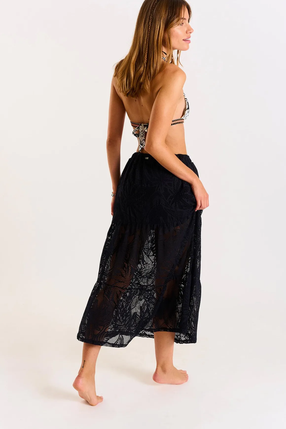 | Details | · Long beach dress · Crochet/lace look · Skirt with double ruffles · Sheer · Banana Moon Collection |