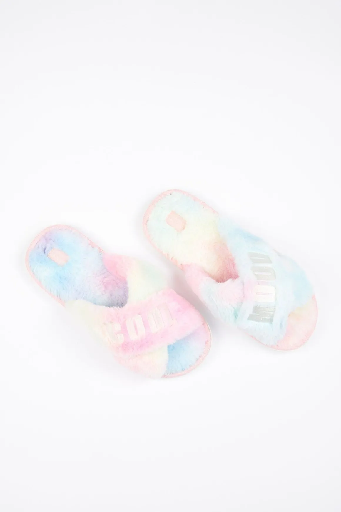 | Details | • Faux fur slippers • Crisscross straps • Cool Mood” tone-on-tone embroidery • Rainbow colors • Anti-slip soles • 3 sizes: 36/37 38/39 40/41 |